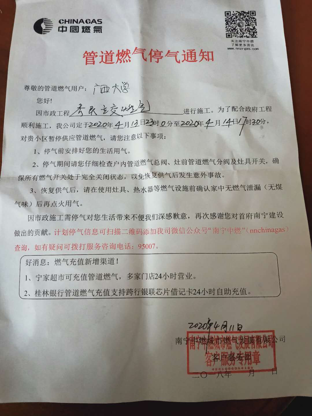 根據南寧中燃城市燃氣發展有限公司客戶服務部的通知,我校的管道燃氣將于2020年4月13日23時0分至4月14日17時30分暫停供應,詳見附件。請各住戶做好停氣準備。不便之處,敬請諒解。